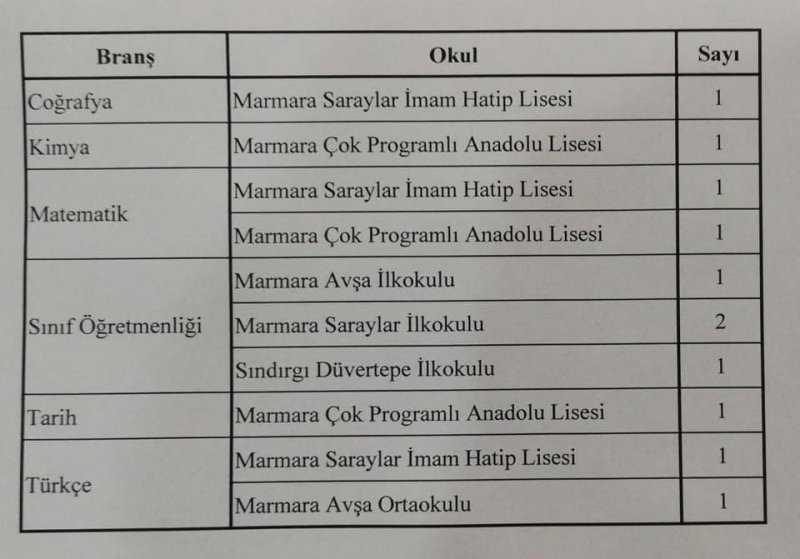 Sözleşmeli öğretmen ataması kapsamında okullarımızdaki boş normlar ve atama yapılacak alanlar doğrultusunda Balıkesir’e atanan 15 öğretmenden listede yer alan branşlarda 10 öğretmen İlçemizde görevlendirilecek.