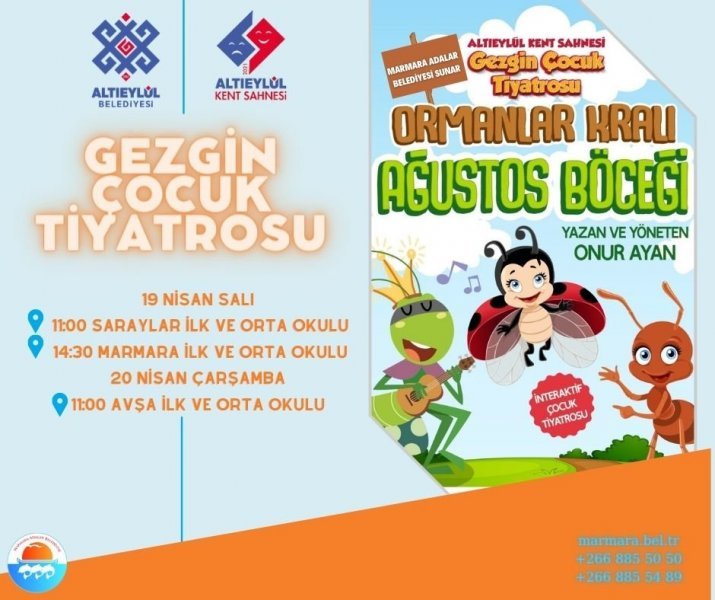 Altıeylül Belediyemizin katkıları ile Altıeylül Kent Sahnesi Gezgin Çocuk Tiyatrosu '' Ormanlar Kralı Ağustos Böceği '' adlı oyun için Adalarımıza geliyor.