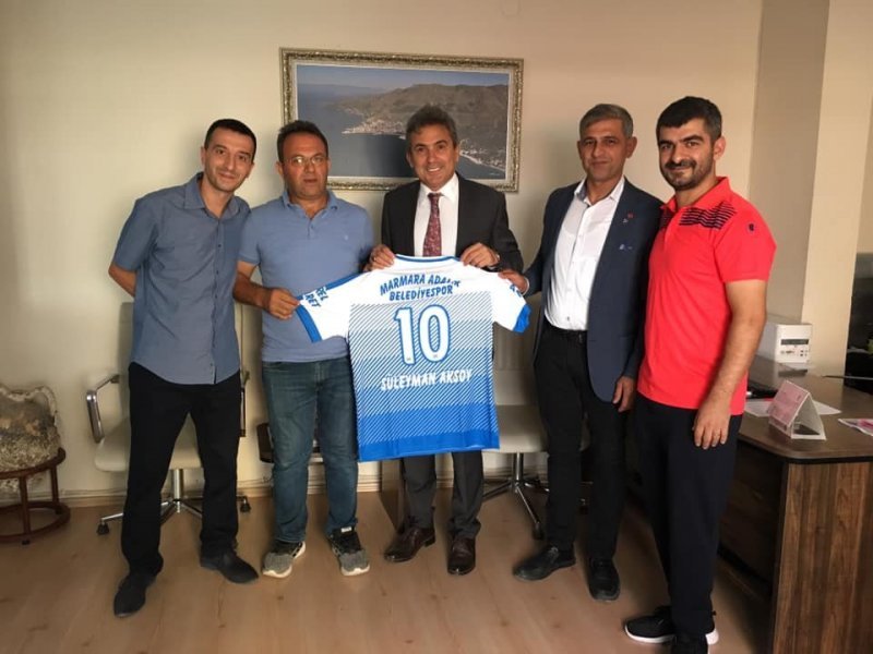 Marmara Adalar Belediyespor Başkanı Gazi Birinci, Yönetici Ekrem Çolak, Antrenör Mustafa Gündoğan ve MHP İlçe Başkanı Özkan Öztürk başkan Aksoy’u makamında ziyarete gelerek 10 numaralı Marmara Adalar Belediyespor formamızı hediye ettiler.